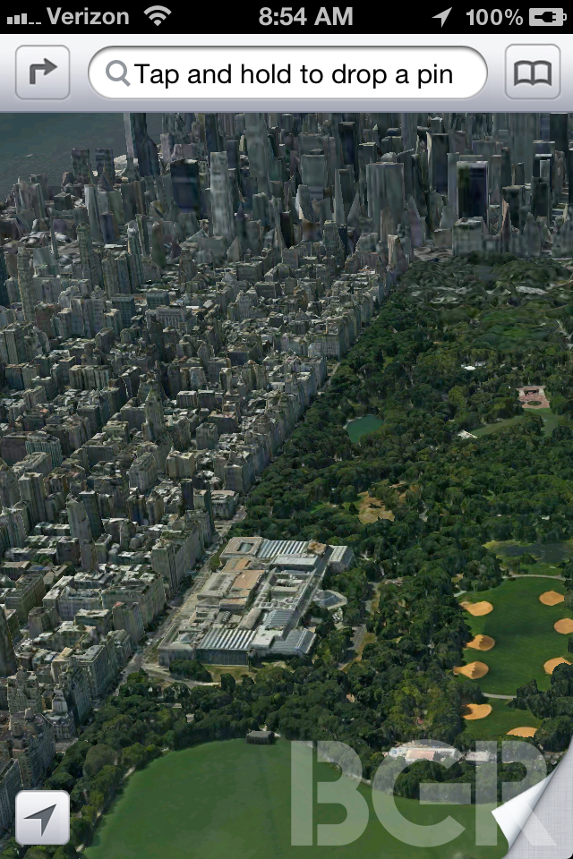 En effet, le site BGR a réussi à mettre la main sur plusieurs images qui semblent montrer ce que sera le prochaine système de cartographie de l’iPhone et donc vraisemblablement d’iOS 6. Comme on peut le voir, la grosse différence, en plus du fait qu’il s’agisse d’un service interne de l’entreprise et que cela mette un terme à la collaboration avec Google sur ce point, c’est son système 3D.