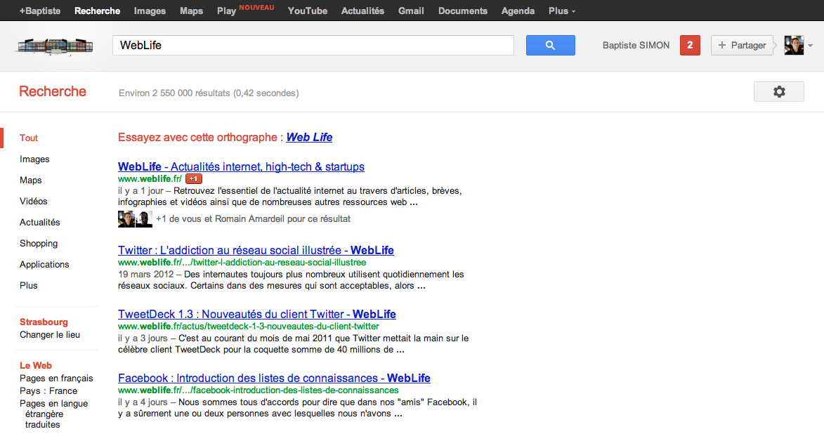 De plus, les boutons Google+1 dans les pages de résultats, globalement mis à jour en début de mois sur le réseau social Google+ et pour les boutons installés sur les sites internet, font leur entrée aux côtés de l’URL dans les snippets.