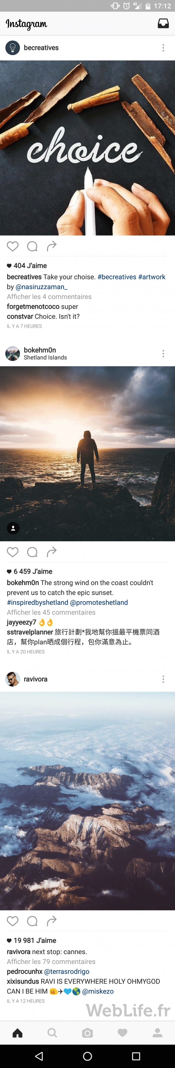 L’ordre des photos n’est en effet pas antéchronologique par rapport à l’heure de publication (Il y a 7 heures, Il y a 20 heures et finalement Il y a 12 heures). Comme mentionné plus haut, seul Instagram détient actuellement les détails de ce classement qui prend vraisemblablement en compte l’engagement, mais pourquoi pas aussi la relation entretenue avec les profils auxquels les utilisateurs sont abonnés et peut-être encore d’autres éléments.