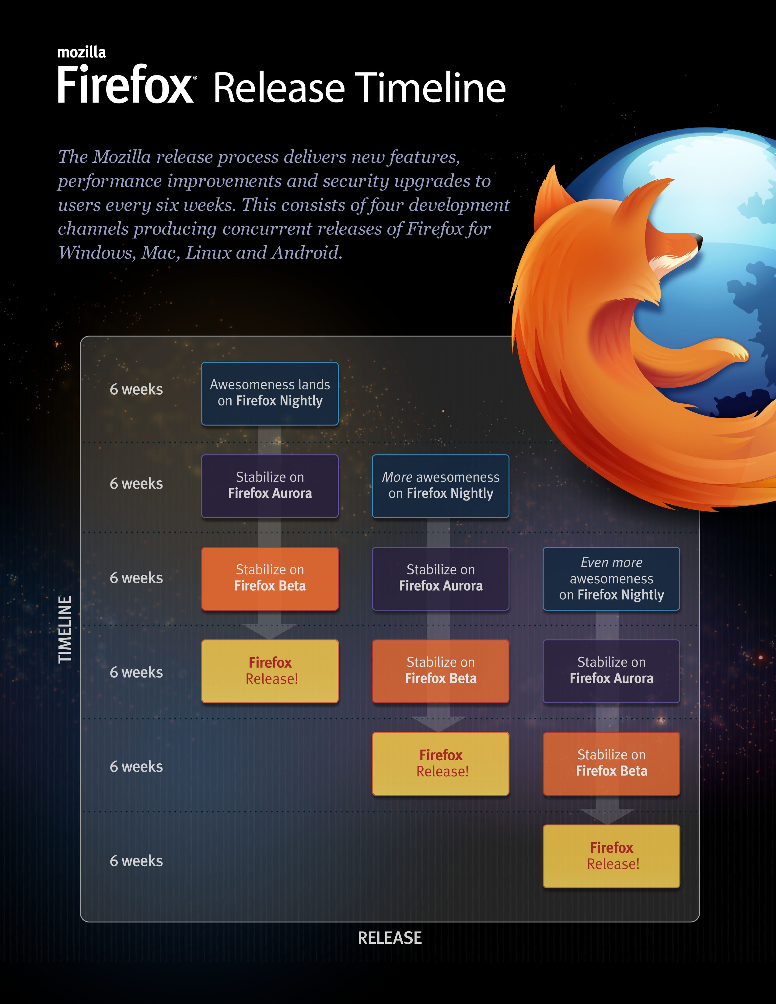 Du côté de l’agenda de déploiement des mises à jour, le cycle de développement adopté est de six semaines. Ainsi, une nouvelle version du navigateur web évoluera de manière constante avec ce même délais au travers des canaux Firefox Nightly, Firefox Aurora, Firefox Beta et enfin Firefox Release.
