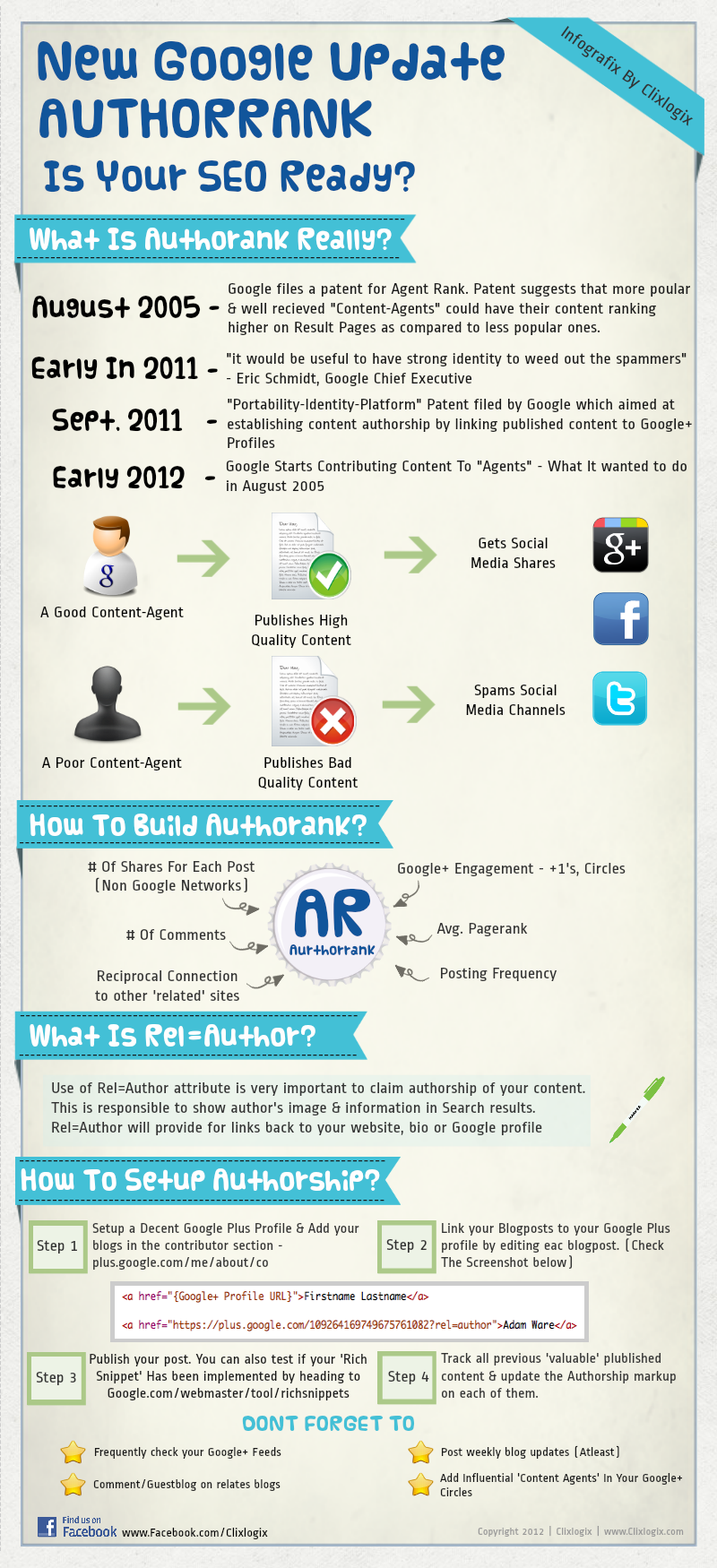 Ce n’est que le début du poids donné aux rédacteurs d’articles et autres actualités dont l’indice est désormais connu : l’AuthorRank. A l’instar du PageRank correspondant à la popularité d’une ressource sur le web, les signaux utilisés dans ce cas par Google sont au travers de l’infographie suivante détaillés, en plus d’un rapide historique et de quelques explications techniques pour permettre la bonne prise en compte de votre compte Google+ si vous êtes auteurs.