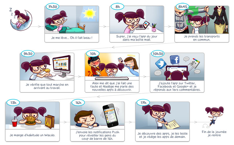 Alors déjà, c’est 100% humain (c’est pas rien de le dire ^-^) ! Pour le fonctionnement, au sein de l’équipe, on aime bien l’appeler le « Cercle vertueux » ! Parce qu’on propose à la fois à nos utilisateurs des bons plans où ils sont gagnants, mais on permet aussi du même coup de mettre sur le devant de la scène un éditeur ou un développeur d’applications ! Alors, ça fonctionne de manière assez simple, voici ma petite journée en détail :