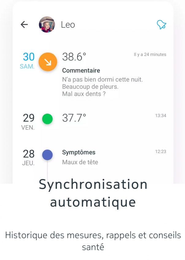 L’intérêt des objets connectés -quels qu’ils soient- est de pouvoir visualiser, centraliser et exploiter leurs données depuis un smartphone ou un site web. Dans notre cas, l’application Nokia Thermo (disponible gratuitement sur iOs et Android) permettra de suivre l’évolution de vos épisodes fiévreux. On apprécie d’autant plus quand ces objets connectés sont intelligents, c’est le cas du Thermo qui interprète les données, effectue des diagnostics, donne des conseils et va même jusqu’à préconiser une certaine posologie en fonction de l’âge, de la taille et du poids du « patient ». Attention, cela ne doit pas vous empêcher de consulter votre médecin et l’application saura vous le rappeler.