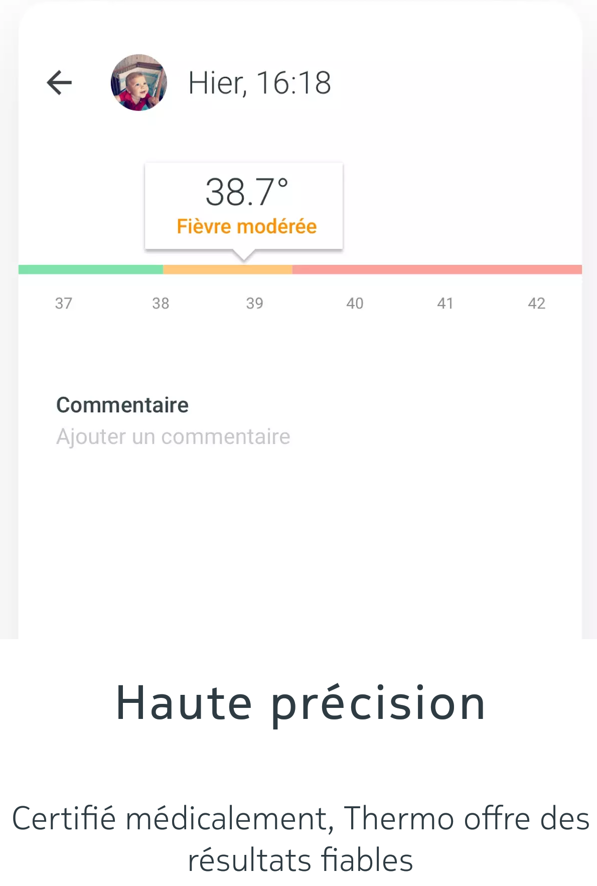 L’application permet également d’ajouter manuellement des commentaires, symptômes, médicaments pris et même des photos. De quoi avoir un journal de votre santé le plus complet possible. Vous pourrez aussi programmer des rappels de prise de température.