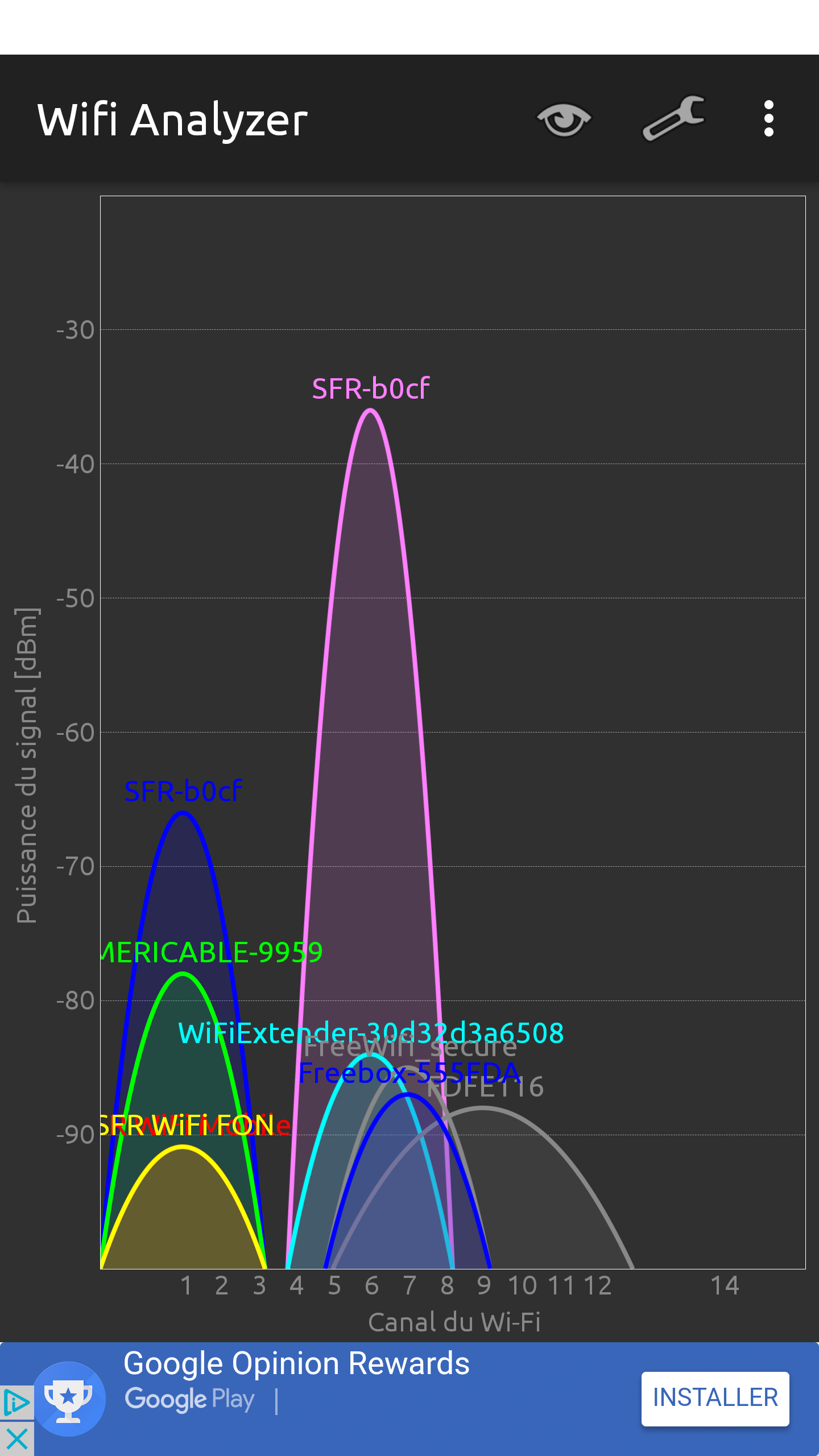 Avant de rentrer dans les détails, il va falloir déterminer le meilleur emplacement pour votre nouvelle installation WiFi. Pour ce faire, nous vous suggérons de « scanner » votre logement avec l’application Android WiFi Analyser. Elle vous permettra par ailleurs de mesurer la performance de votre réseau, en complément d’un SpeedTest. Une fois votre dLAN 1200+ bien implanté, vous pourrez profiter d’un réseau WiFi de qualité sans zones d’ombres, voyez plutôt :
